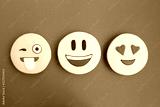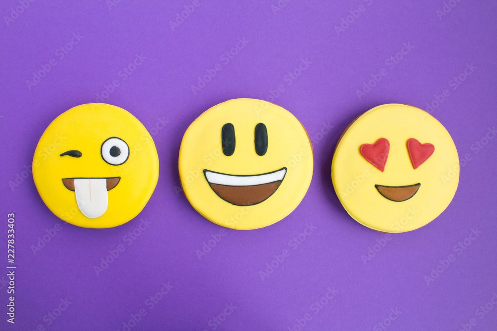 Smileys in the form of gingerbread on the violet background.Top view.Closeup.Copy space.