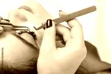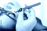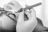 Eyelash Extension Procedure. Woman Eye with Long Eyelashes. Close up, selective focus.