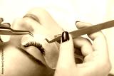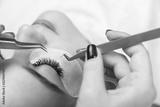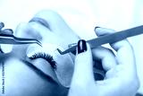 Eyelash Extension Procedure. Woman Eye with Long Eyelashes. Close up, selective focus.