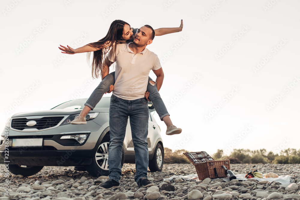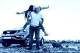 Happy Couple on Roadtrip into the Sunset in SUV Car