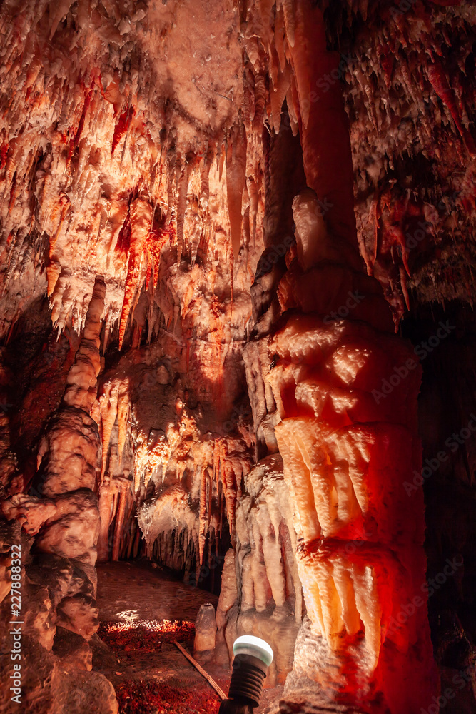 Big stalactites hanging down limestone cave ceiling