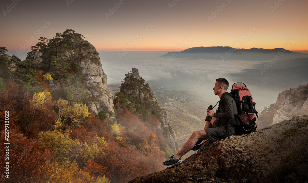 Young man hiker with backpack and binoculars sitting on a cliff and enjoying a Mountain view.