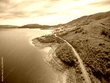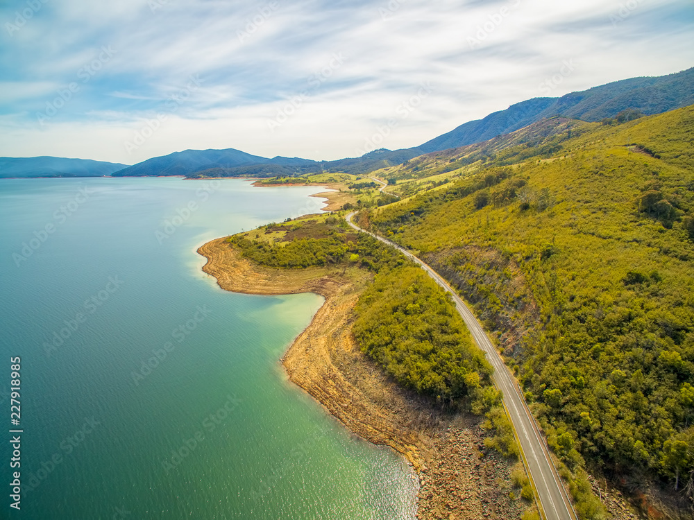 Rural road winding along shore of Blowering Reservoir - aerial view