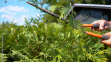 CLOSE UP: Unrecognizable gardener trimming the outgrown bush on sunny summer day
