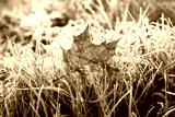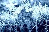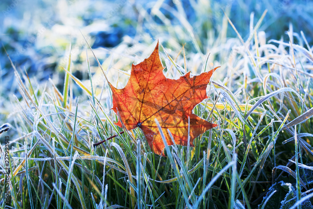 natural background beautiful bright Golden maple leaf lies on the grass covered with white frost in the morning autumn garden