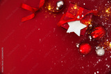 Christmas and New Year holiday background. Xmas greeting card. Christmas gifts on red background top view.
