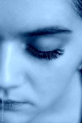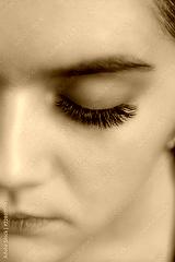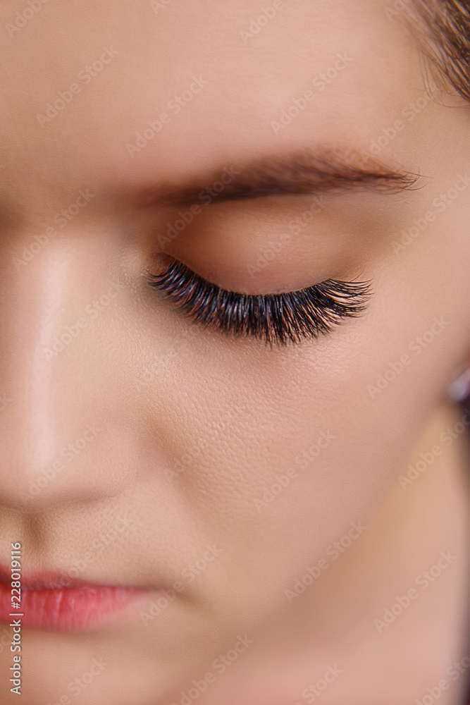 Eyelash Extension Procedure. Woman Eye with Long Eyelashes. Close up, selective focus.