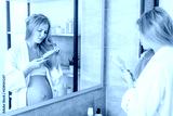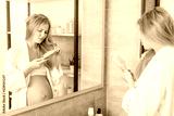 sad pregnant woman with hair problems standing in front of mirror in bathroom