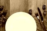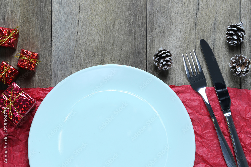 Empty Blue plate and Christmas Decoration Equipment on wooden floor.