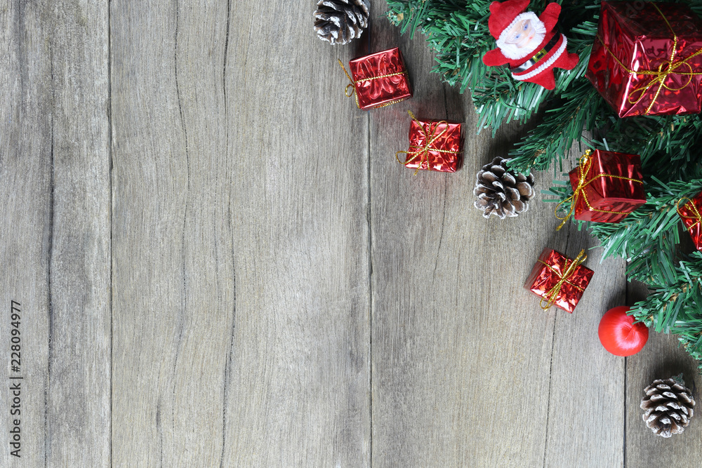 Green Pine and Christmas Decoration Equipment on wooden floor.