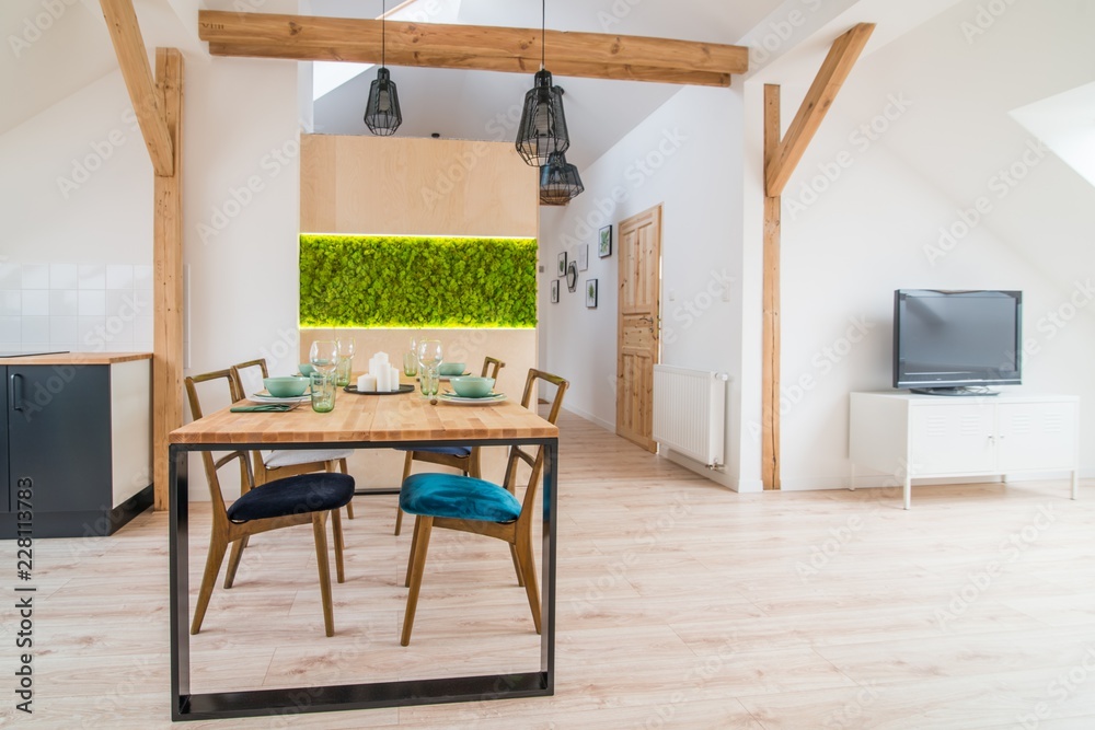 Open bright kitchen with black kitchen cabinets and table