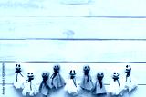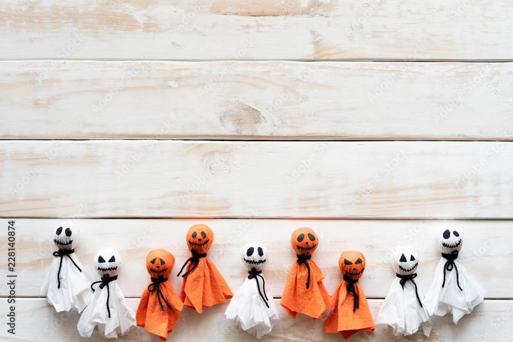 Top view of Halloween crafts, white and orange paper ghost on white wooden background with copy space for text. halloween concept.