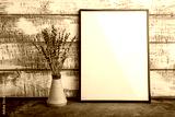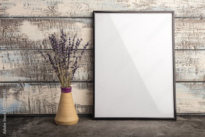 Mock up of an empty frame poster on a wall of wooden boards. A bunch of lavender in a vase