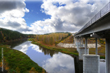 road bridge over the river with supports on the background of the autumn forest and colorful sky with clouds