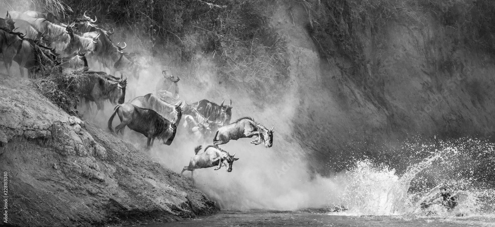 Wildebeests are crossing Mara river. Great Migration. Kenya. Tanzania. Maasai Mara National Park.