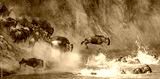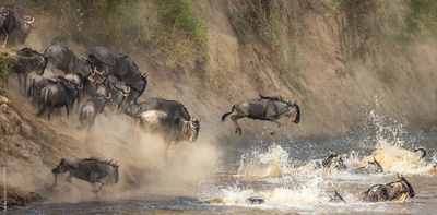 Wildebeests are crossing Mara river. Great Migration. Kenya. Tanzania. Maasai Mara National Park.