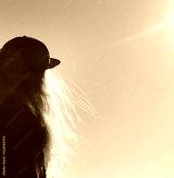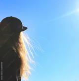 Young Girl Wearing Casual Women Fashion Clothes: Hoodie and Snapback Cap, Back Side Portrait. Stylish Female in All Black Clothes Standing Alone on Empty Blue Sky Background with Warm Sunlight Glow