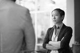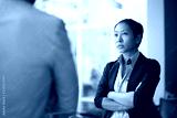 Tense Asian businesswoman looking at male partner with crossed arms. Two colleagues confronting each other in office space. Clashing personalities concept