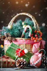 Merry Christmas and happy new year. Basket with Christmas toys and Christmas gifts on a wooden background.