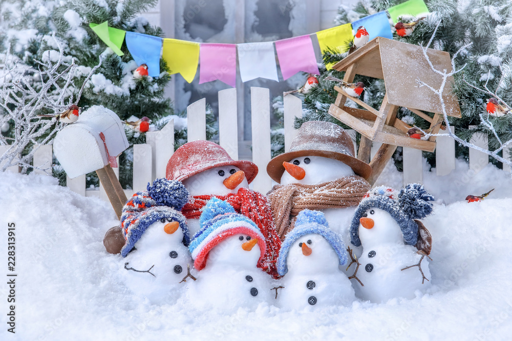 Postcard with Christmas and a new year with cute snowmen