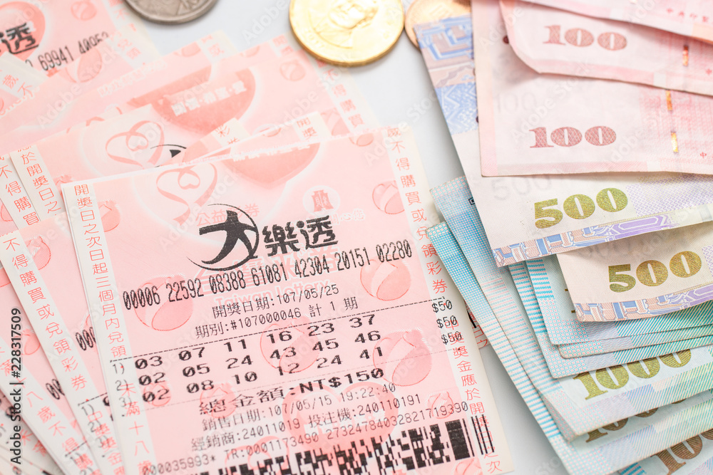 Taipei, Taiwan - 7 Oct 2018: Closeup of Taiwanese currency & Taiwan lottery tickets: Big Lotto.