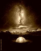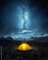Camping in the wilderness. A pitched tent under the glowing night sky stars of the milky way with snowy mountains in the background. Nature landscape photo composite.