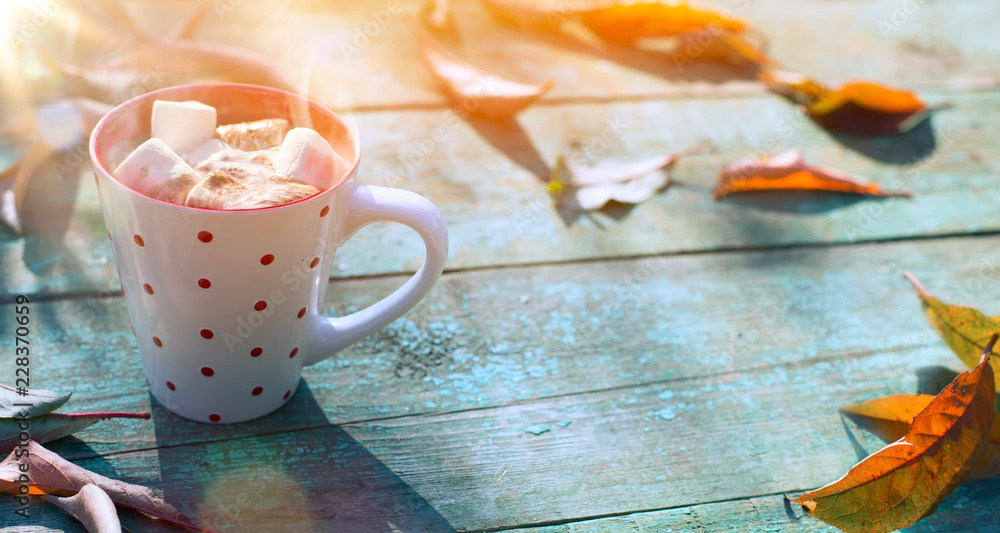 Autumn food background; cup of cocoa with marshmallow and autumn leaves on sunny background
