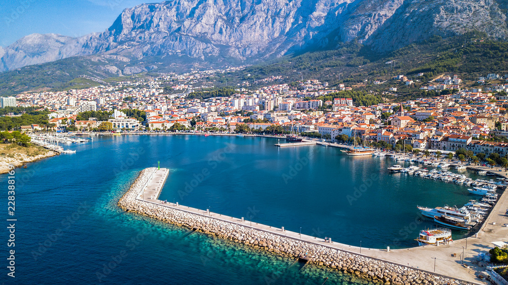 Europe. Makarska. Croatia. Coast, Bay and historic center view from the height