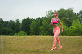 Woman running in green park on summer day