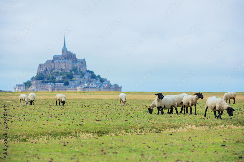 Beautiful view of famous historic Le Mont Saint-Michel tidal island with sheep grazing on fields of fresh green grass on a sunny day, France