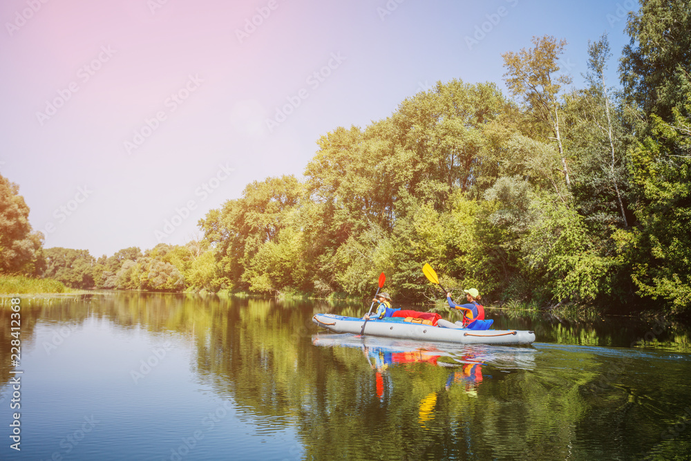 Happy kids kayaking on the river on a sunny day during summer vacation