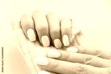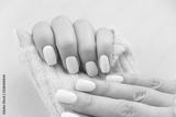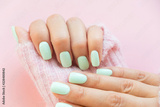 Tender hands with perfect blue manicure on trendy pastel pink background. Place for tex