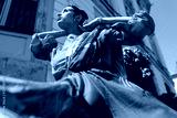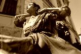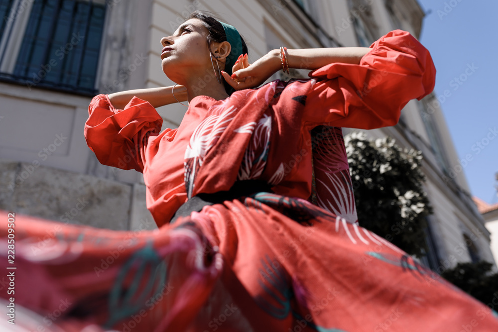 Portrait of a young woman in red clothes posing on the background of old building in Warsaw, Poland. Fashion concept