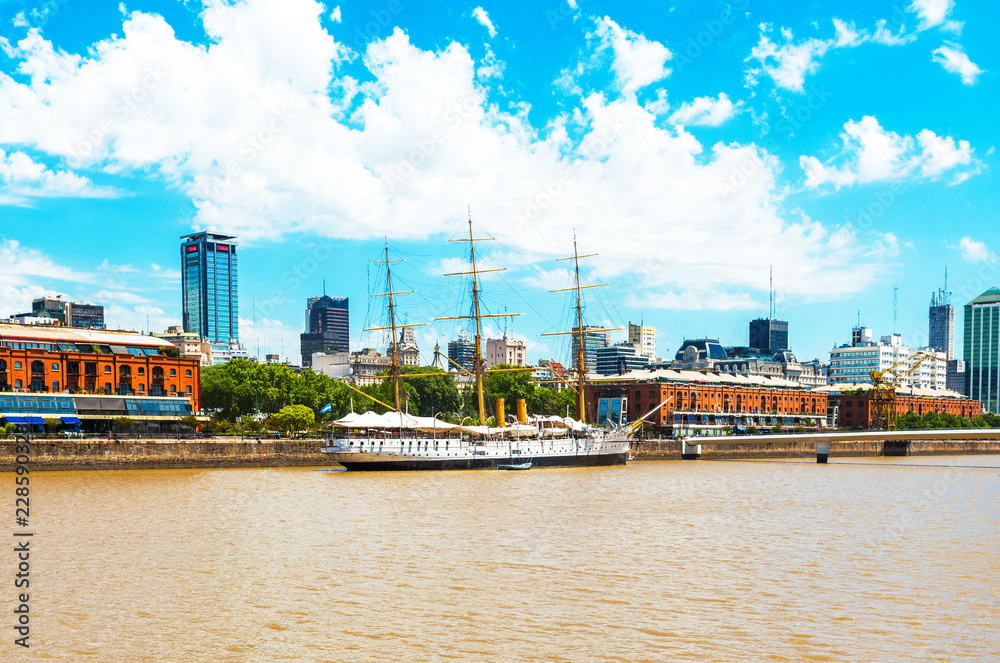 View of Puerto Madero with a Barque , Buenos Aires, Argentina. Copy space for text.