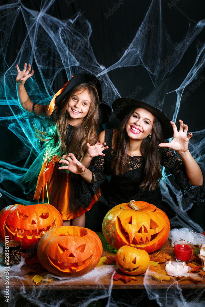 Cute little girl and her beautiful mom in witch hats and costumes are looking at camera and having fun on black background decorated for Halloween