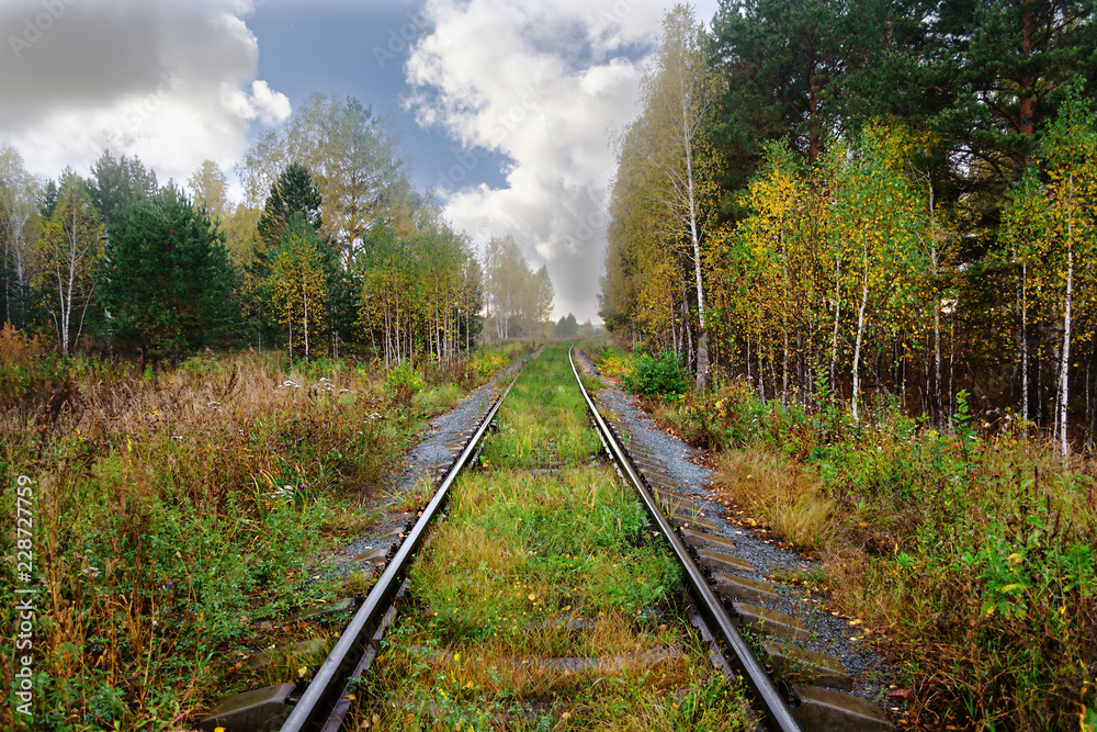old railroad passes through a picturesque autumn forest with yellow foliage at sunset lit by the rays of the sun
