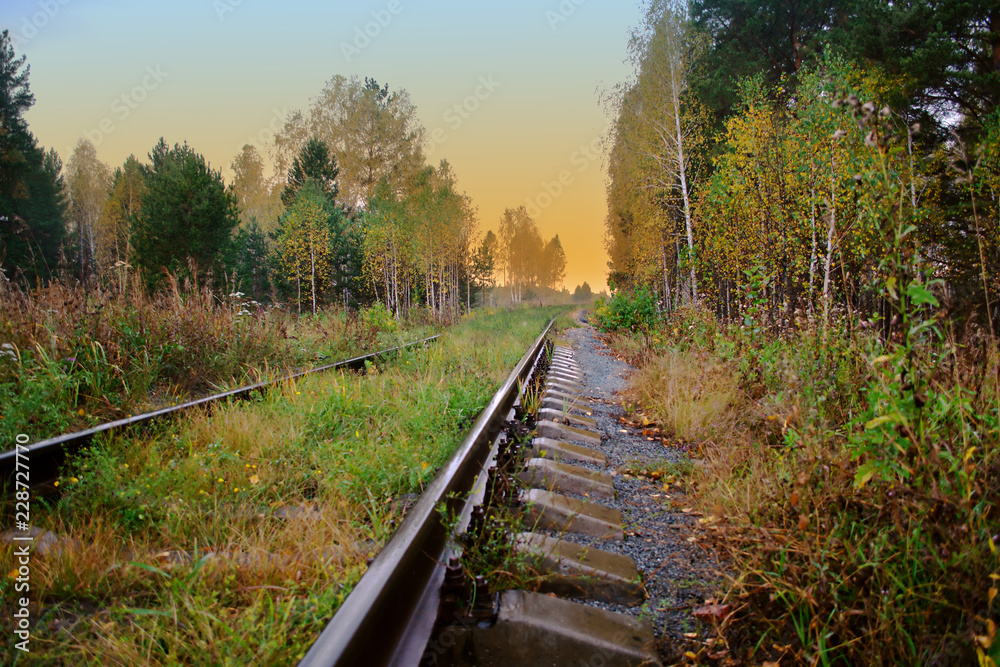 old railroad passes through a picturesque autumn forest with yellow foliage at sunset lit by the rays of the sun