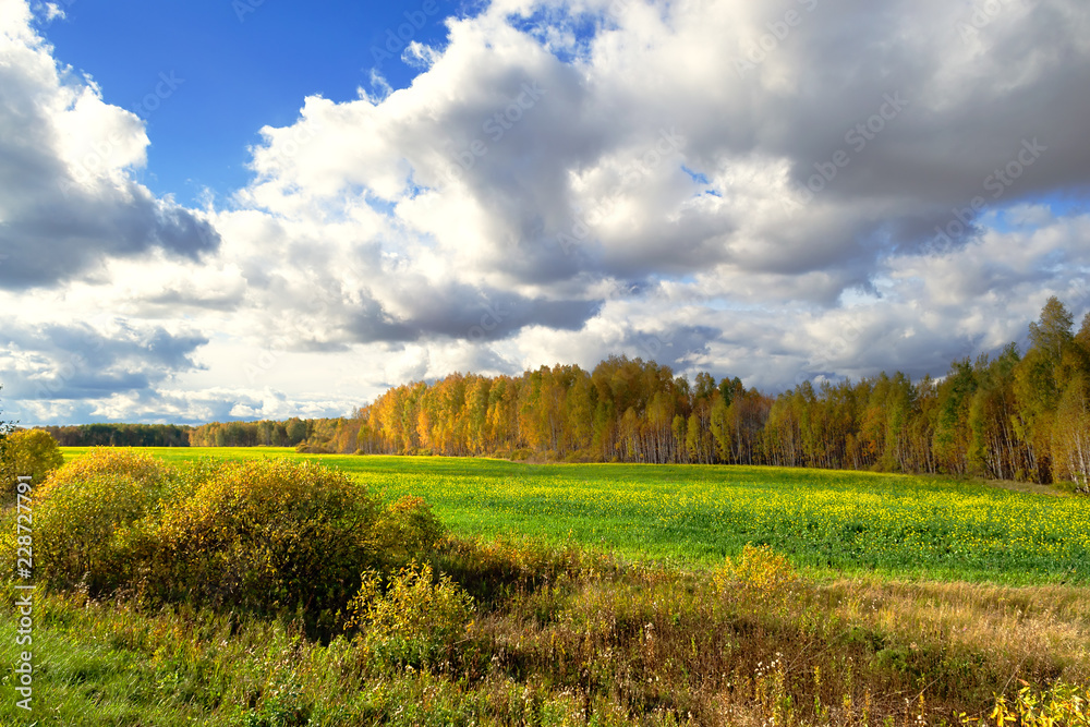 autumn forest with yellow leaves in front of a colza field, landscape with beautiful sky and nature