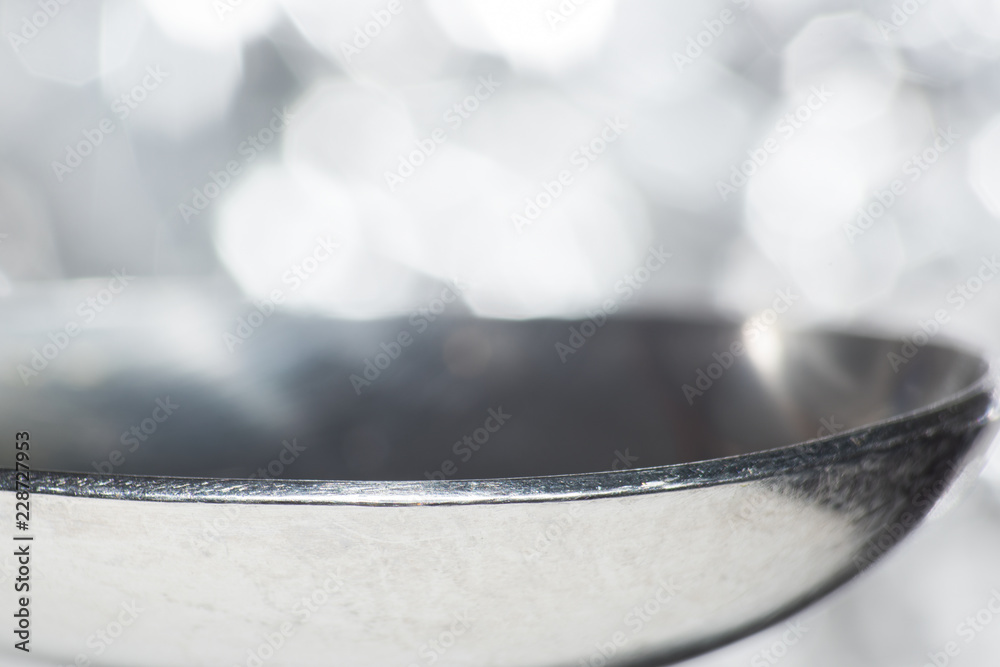 Metal spoon is close on bokeh background