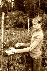 The peas grow in the garden and ripen. The gardener ties up ropes for vegetable culture.
