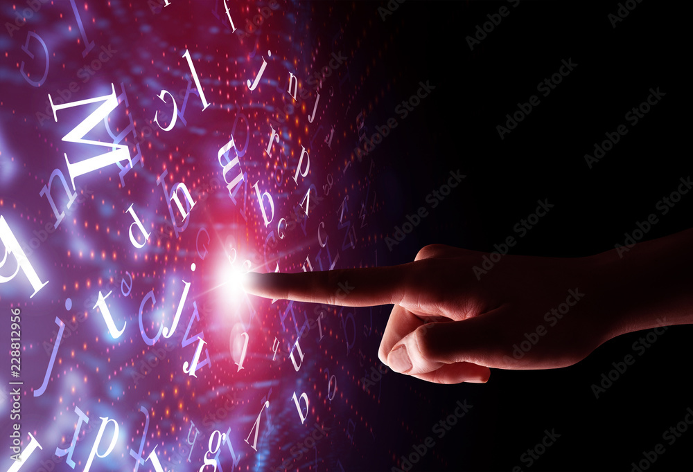 Female finger touching a beam of light surrounded by a pink background with alphabet letters