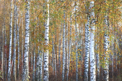 beautiful scene with birches in yellow autumn birch forest in october among other birches in birch grove
