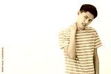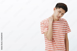 Portrait of bothered uneasy young asian man in striped t-shirt unwilling to do something rubbing neck tilting head and frowning expressing displeasure and awkward feeling over white background