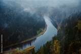 Autumn landscape: fog over the river in the autumn forest, top view. Wilderness.