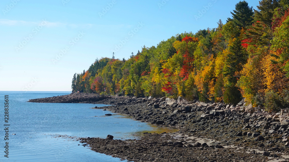 AERIAL: Black rocky coast and colorful forest on a beautiful sunny fall day.