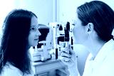girl getting eye exam at doctors office. Children eye examination procedure, real patients