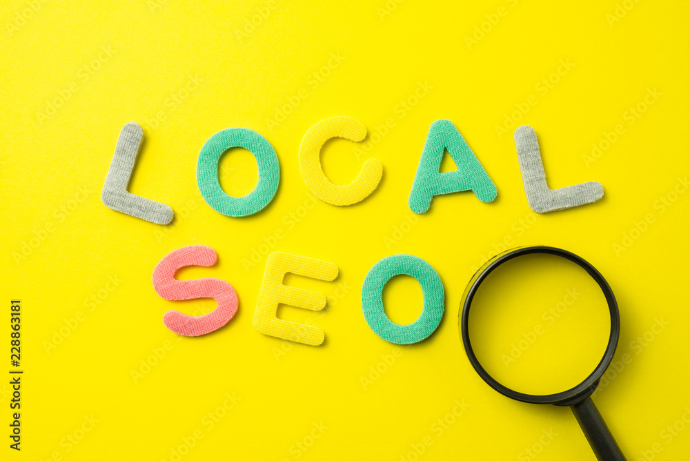 Local SEO Search Engine Optimization multi color logo alphabets ranking concept with magnifying glass. Local SEO is an effective way to market business online.
