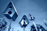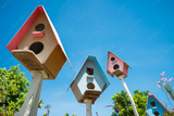 Colorful bird house in summer with sunny day blue sky - green nature background