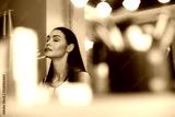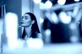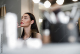 Perfect appearance. Makeup artist appliering classic version of bright red lipstick