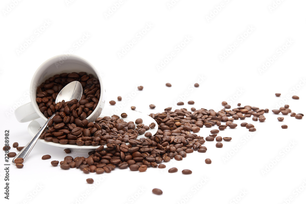 Overturned Coffee Beans and Cup Isolated on White Background with copy space